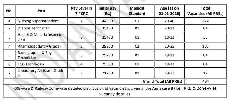 RRB Paramedical Recruitment 2025: The Ministry of Railways has officially approved the release of the RRB Paramedical Recruitment 2025 through Centralized Employment Notification (CEN). A total of 434 vacancies have been announced across seven paramedical categories including Nursing Superintendent, Pharmacist, Radiographer, ECG Technician, and more. The recruitment process will be conducted by the respective Railway Recruitment Boards (RRBs). Interested candidates are advised to stay updated with the RRBs’ official websites for the detailed notification and application schedule, expected soon.